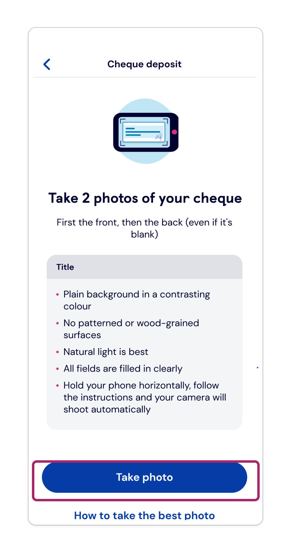 Tap ‘Take photo’. Hold your phone above the cheque and follow the on-screen prompts. Your camera will then take the photo automatically.
